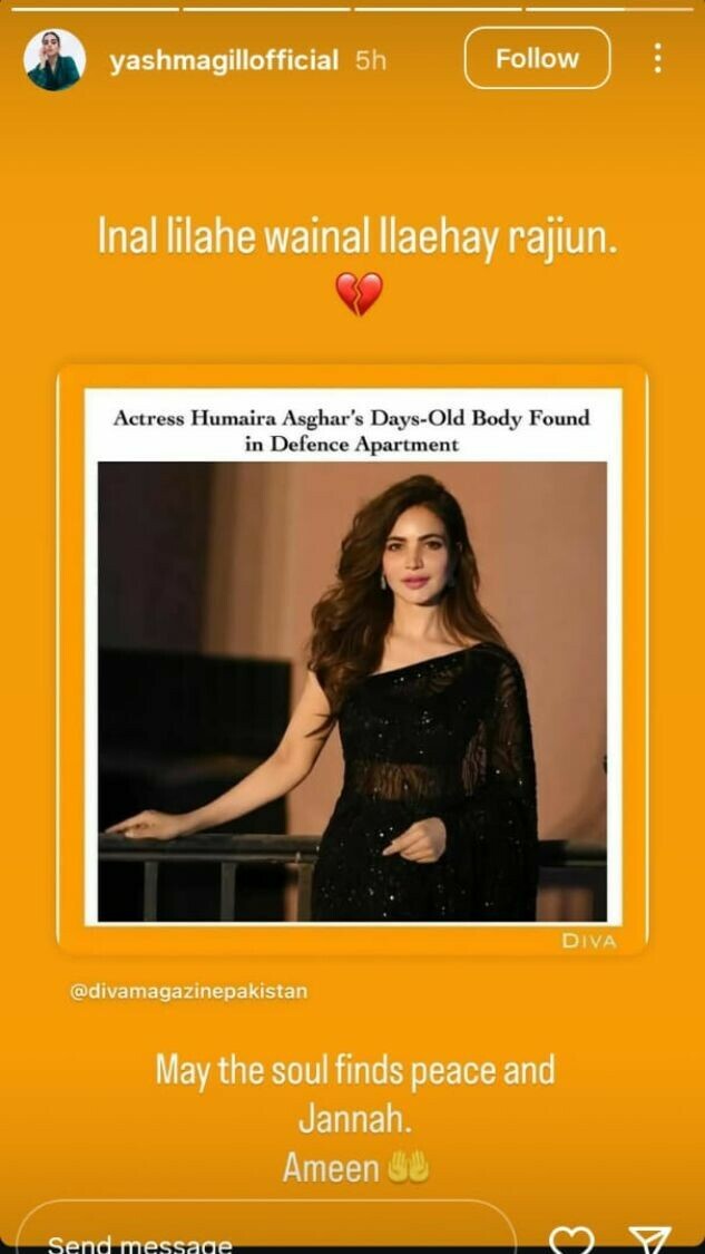 اداکارہ یشما گل نے بھی حمیرا اصغر کے انتقال کی خبر شیئر کرتے ہوئے ان کے لیے دعا کی کہ اللہ تعالیٰ انہیں جنت نصیب فرمائے۔