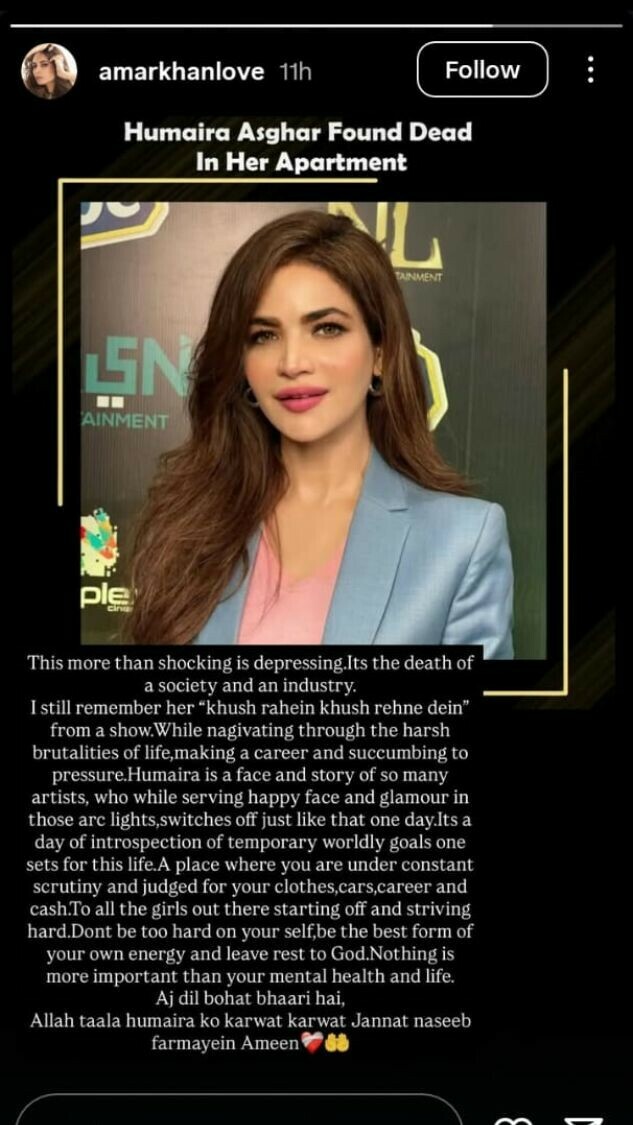 اداکارہ و لکھاری امر خان نے اپنی انسٹاگرام پوسٹ میں لکھا کہ ’یہ خبر صرف چونکا دینے والی نہیں بلکہ دل توڑ دینے والی ہے، یہ ایک معاشرے اور انڈسٹری کی موت ہے‘۔