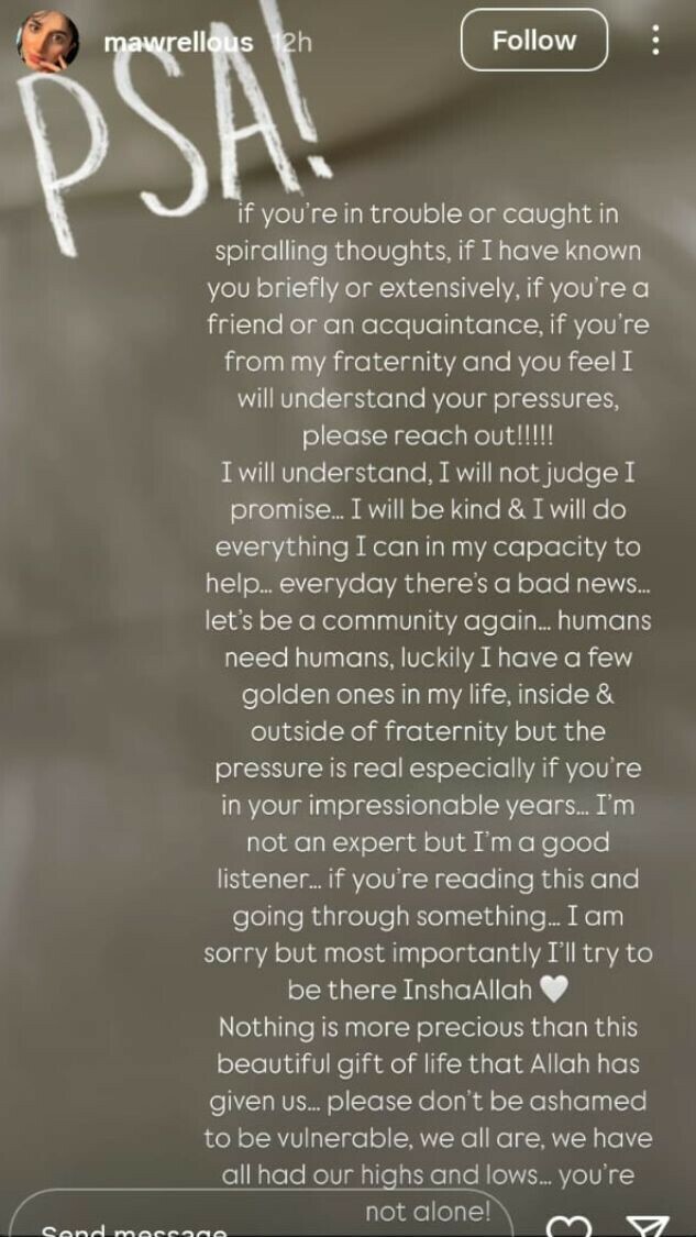 اداکارہ ماورا حسین نے انسٹاگرام پر ایک جذباتی پیغام شیئر کرتے ہوئے سب کو مخاطب کیا ہے کہ اگر کوئی بھی شخص کسی مشکل یا پریشانی میں مبتلا ہے، چاہے وہ انہیں ذاتی طور پر جانتی ہوں یا نہیں، تو وہ ان سے رابطہ کر سکتے ہیں۔