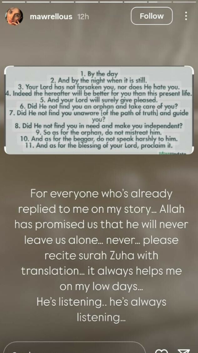 ماورا حسین نے سورۃ الضحیٰ ترجمے کے ساتھ پڑھنے پر بھی زور دیا اور کہا کہ یہ تلاوت ان کے اداس دنوں میں انہیں مضبوط بناتی ہے۔