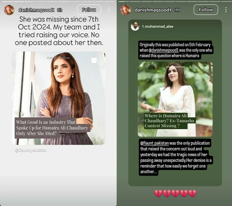 دانش مقصود نے اپنی انسٹاگرام اسٹوریز میں بتایا کہ انہوں نے آخری بار حمیرا اصغر کے ساتھ اکتوبر کے آغاز میں کام کیا اور اداکارہ 7 اکتوبر 2024 کے بعد لاپتہ ہوگئیں۔