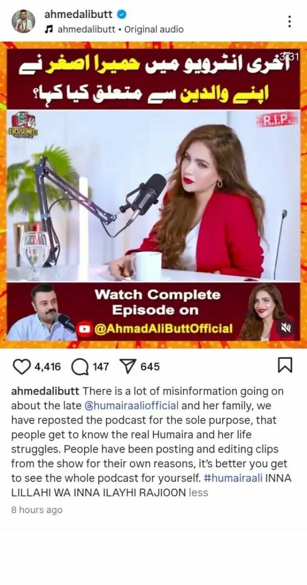 انہوں نے لکھا کہ حمیرا اصغر علی اور ان کے خاندان سے متعلق بہت سی غلط معلومات پھیلائی جا رہی ہیں اور پوڈکاسٹ صرف اس نیت سے دوبارہ شیئر کیا ہے کہ لوگ اصل حمیرا اور ان کی زندگی کی جدوجہد کو جان سکیں۔