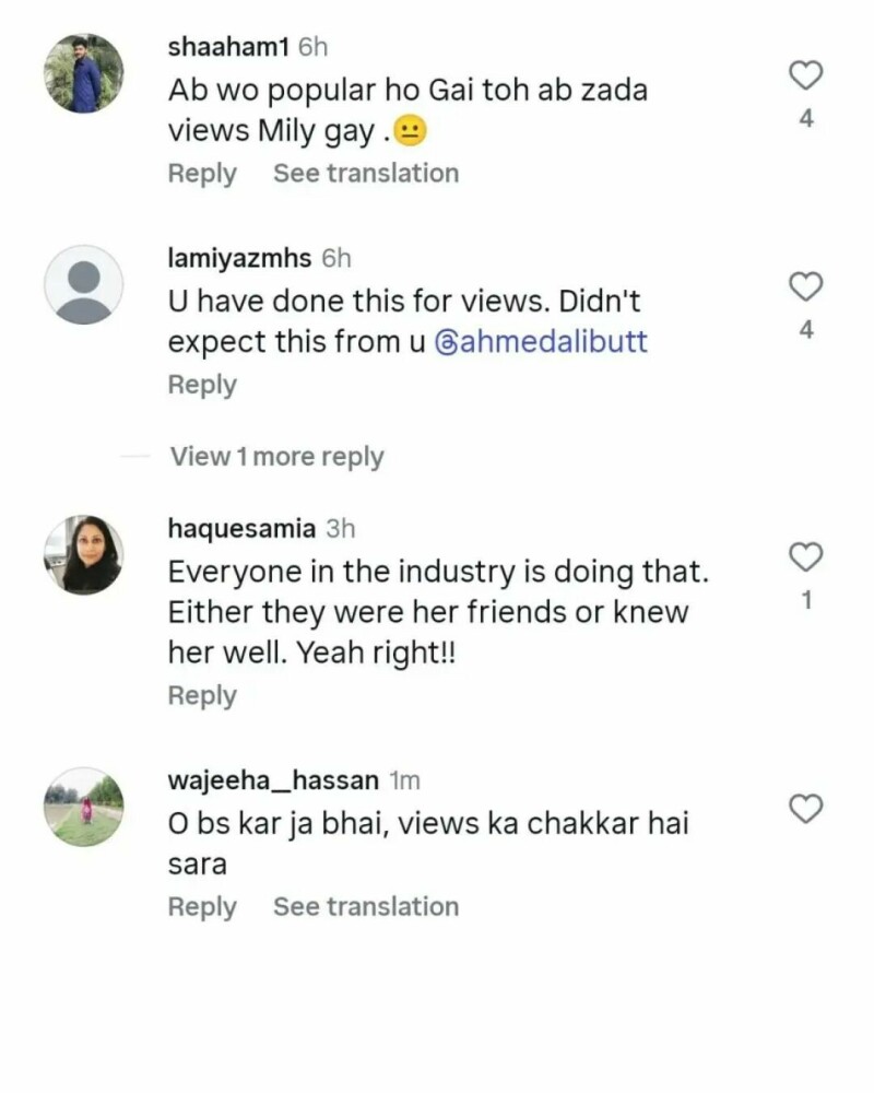 ایک صارف نے لکھا کہ انہوں نے حمیرا اصغر کی ویڈیو کو دوبارہ اس لیے شیئر کیا ہے کیونکہ وہ اب زیادہ مشہور ہو گئی ہیں، جب کہ بعض صارفین نے یہ بھی لکھا کہ انہیں احمد علی بٹ سے ایسی توقع نہیں تھی۔