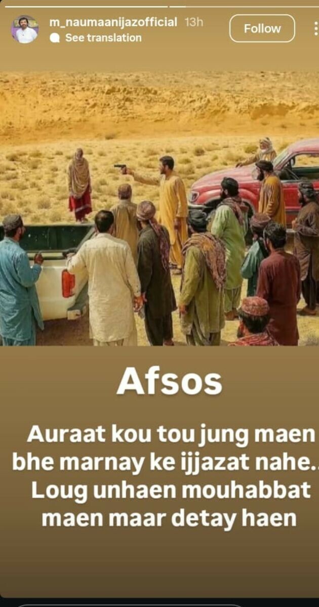 سینئر اداکار نعمان اعجاز نے بھی اس واقعے پر افسوس کا اظہار کرتے ہوئے لکھا کہ خواتین کو تو جنگ میں مارنے کی بھی اجازت نہیں اور لوگ انہیں محبت کرنے کے جرم میں مار رہے ہیں۔