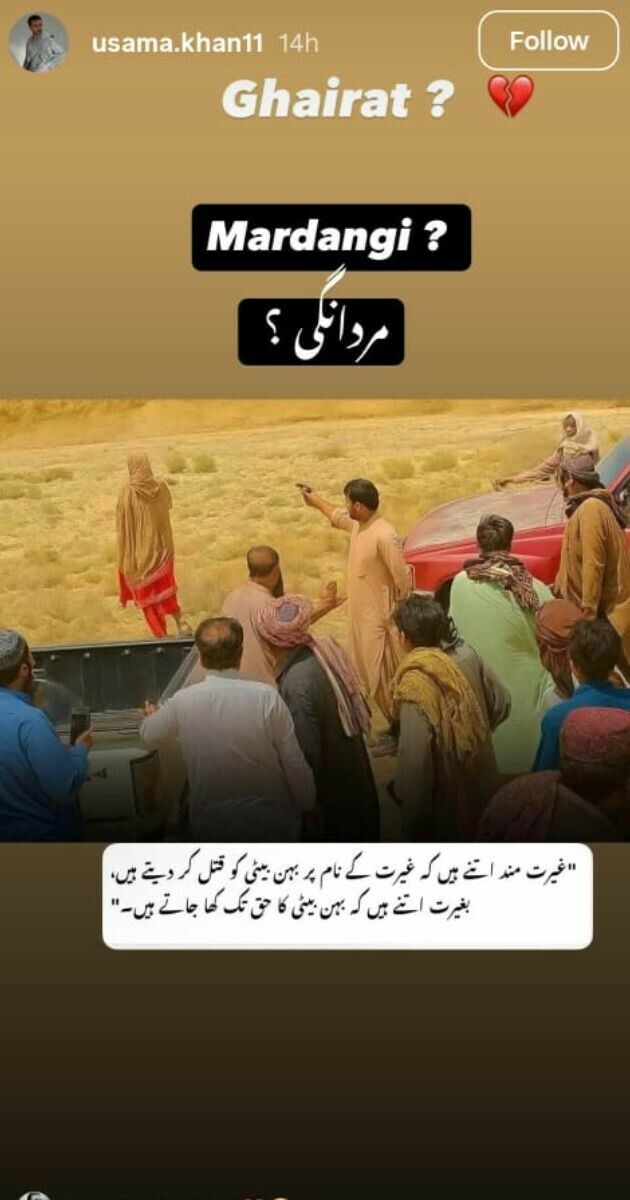 اداکار اسامہ خان نے مذکورہ واقعے کی تصویر شیئر کرتے ہوئے لکھا کہ یہ کون سی مردانگی ہے، جس میں غیرت کے نام پر بیٹی کا قتل کر دیا جاتا ہے لیکن انہیں ان کا حق نہیں دیا جاتا۔