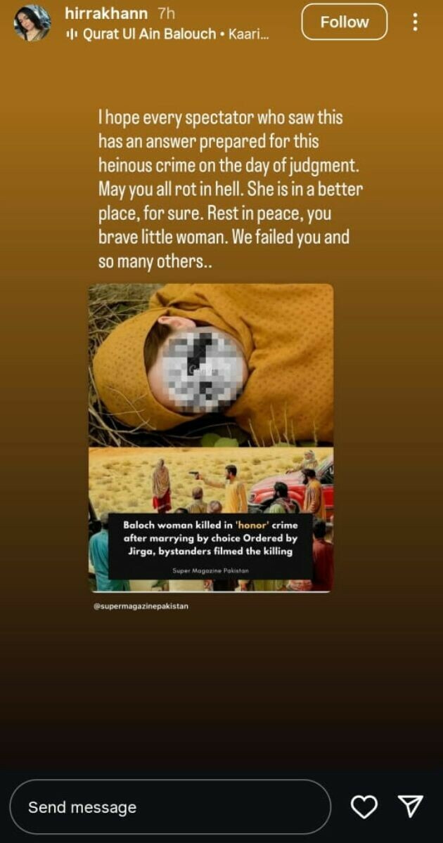 اداکارہ حرا خان نے انسٹاگرام پر لکھا کہ امید ہے کہ جن لوگوں نے یہ قتل اپنی آنکھوں کے سامنے ہوتے دیکھا ہے، ان کے پاس خدا کے سامنے سوال و جواب کے وقت کے لیے جواب تیار ہوگا، خدا کرے کہ تم سب جہنم میں جاؤ۔