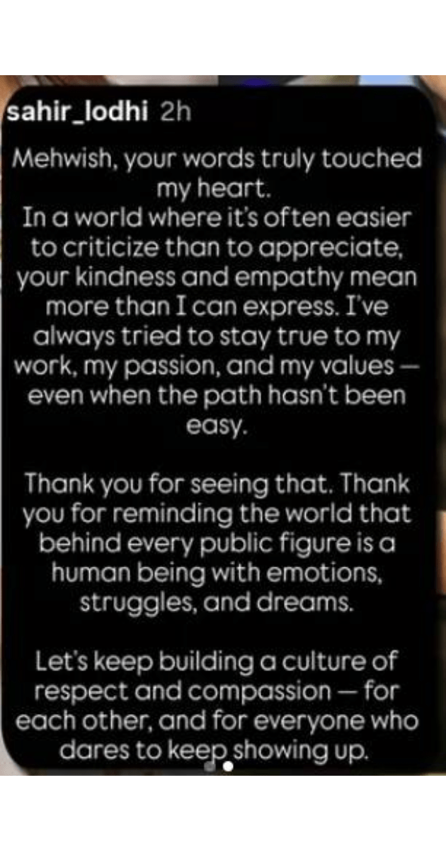 ساحر لودھی نے انسٹاگرام پر مہوش حیات کو مخاطب کرتے ہوئے لکھا کہ مہوش، تمہارے الفاظ دل کو چھو گئے۔
