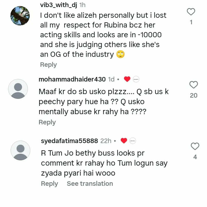 سوشل میڈیا صارفین نے سخت الفاظ کا استعمال کرتے ہوئے روبینہ اشرف کی تنقید پر ناپسندیدگی کا اظہار کیا اور لکھا کہ بطور سینئر انہیں جونیئرز کی حوصلہ افزائی کرنی چاہیے تھی۔