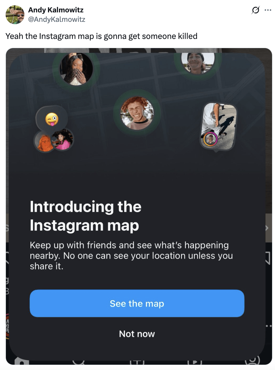 انسٹاگرام نے اس کے ساتھ ایک نیا لوکیشن میپ بھی متعارف کروایا ہے، جو اسنیپ چیٹ کی طرز پر کام کرتا ہے، اس کے ذریعے سے صارف کے قریبی دوست یا منتخب کردہ فالوورز یہ جان سکیں گے کہ وہ اس وقت کہاں پر موجود ہیں۔