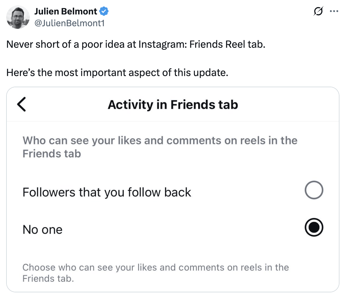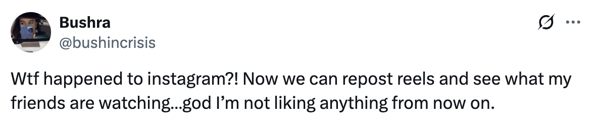 ان کے مطابق لوگ اُس مواد کو دیکھنے میں زیادہ دلچسپی رکھتے ہیں جو اُن کے دوست پسند کرتے ہیں، بجائے اس کے کہ انسٹاگرام الگورتھم کے تحت اجنبی لوگوں کی ویڈیوز دیکھیں۔