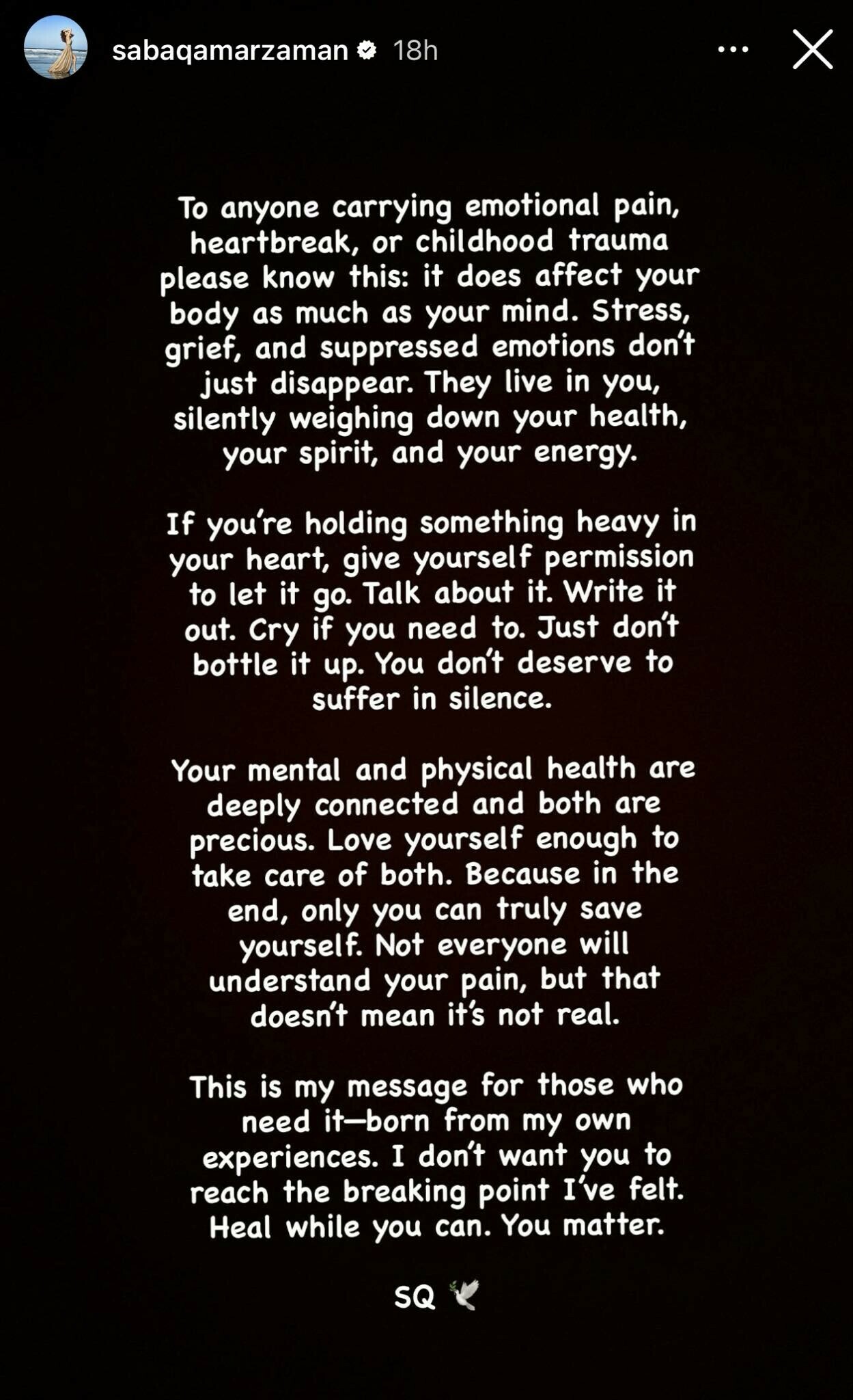 اداکارہ نے انسٹاگرام اسٹوری پر جذباتی نوٹ میں لکھا کہ بچپن کے صدمے، دل کی ٹوٹ پھوٹ اور جذباتی تکلیف کوئی خیالی بات نہیں بلکہ یہ حقیقی زخم ہیں جو اگر نظر انداز کیے جائیں تو وقت کے ساتھ ہمارے اندر گہرائی میں جڑ پکڑ لیتے ہیں اور جسم و ذہن دونوں پر اثر انداز ہوتے ہیں۔