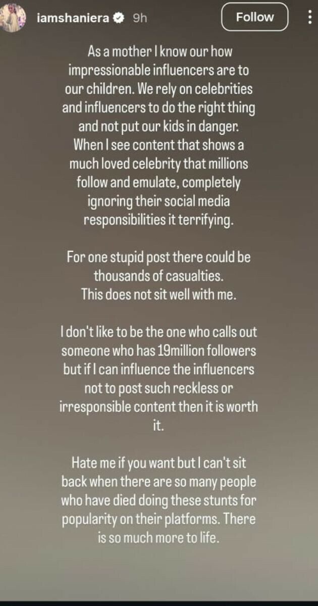 انہوں نے کہا کہ ایک ماں ہونے کے ناطے وہ چاہتی ہیں کہ ہمارے بچے جن معروف شخصیات اور انفلوئنسرز کو فالو کرتے ہیں وہ ذمہ دارانہ پوسٹ کریں اور ایسی بے وقوفانہ پوسٹ نہ کریں جس سے کئی لوگوں کی جانوں کو خطرہ ہو سکتا ہے۔