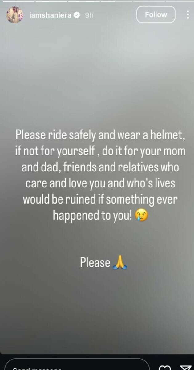 شنیرا اکرم نے درخواست کی کہ براہِ کرم محفوظ سواری کریں اور ہیلمٹ پہنیں، اگر اپنے لیے نہیں تو اپنے والدین اور ان افراد کے لیے جو آپ سے محبت کرتے ہیں، جن کی زندگی برباد ہو سکتی ہے اگر آپ کے ساتھ کچھ ہو گیا تو۔