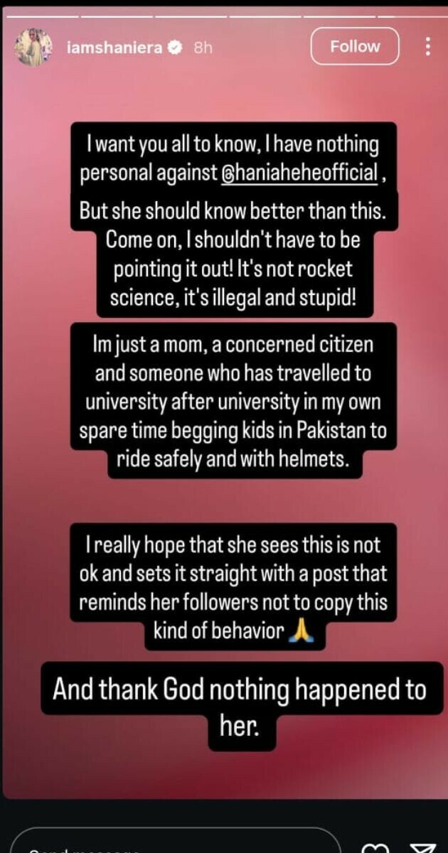شنیرا اکرم نے انسٹاگرام اسٹوری میں ہانیہ عامر کی ویڈیو کا اسکرین شاٹ شیئر کرتے ہوئے انہیں ہدایت کی کہ وہ روڈ سیفٹی کو ترجیح دیں۔