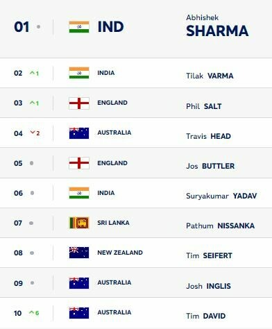 آئی سی سی کی جانب سے جاری نئی ٹی20 بیٹرز رینکنگ میں بھارت کے نوجوان بلے باز ابھیشیک شرما کا پہلا نمبر برقرار ہے جب کہ دوسرے نمبر پر بھی بھارتی کھلاڑی تلک ورما موجود ہیں۔