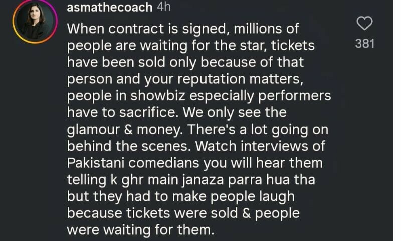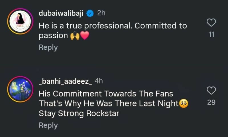 ایک صارف نے لکھا کہ جب معاہدے پر دستخط ہوجاتے ہیں تو پھر اسے ہر صورت پورا کرنا ہوتا ہے، مداح اپنے پسندیدہ گلوکار کو سننے کے لیے بے چین ہوتے ہیں اور اسی وجہ سے ٹکٹ بھی فروخت ہوتے ہیں، لوگ صرف شوبز کی چکاچوند اور پیسہ دیکھتے ہیں، جب کہ پس منظر میں کیا ہو رہا ہوتا ہے کوئی بھی اس سے باخبر نہیں ہوتا۔