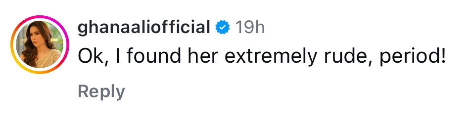غنا علی نے مختصرا لکھا کہ انہوں نے روبی انعم کو انتہائی بدتمیز پایا، بس!