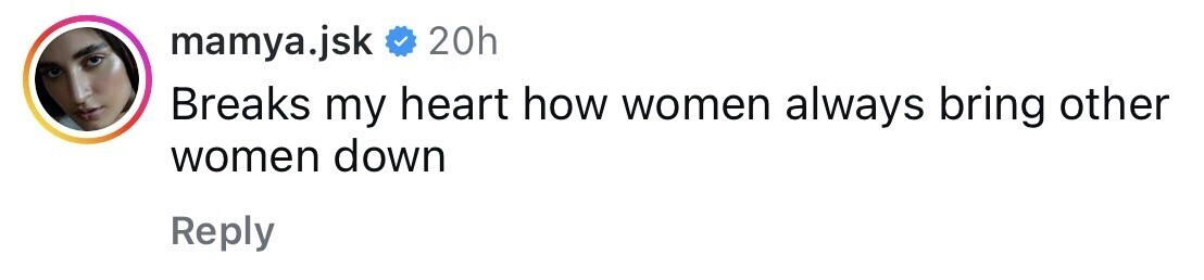 ممیا شاجعفر نے لکھا کہ یہ دل توڑنے والی بات ہے کہ خواتین ہمیشہ دوسری خواتین کو نیچا دکھاتی ہیں۔
