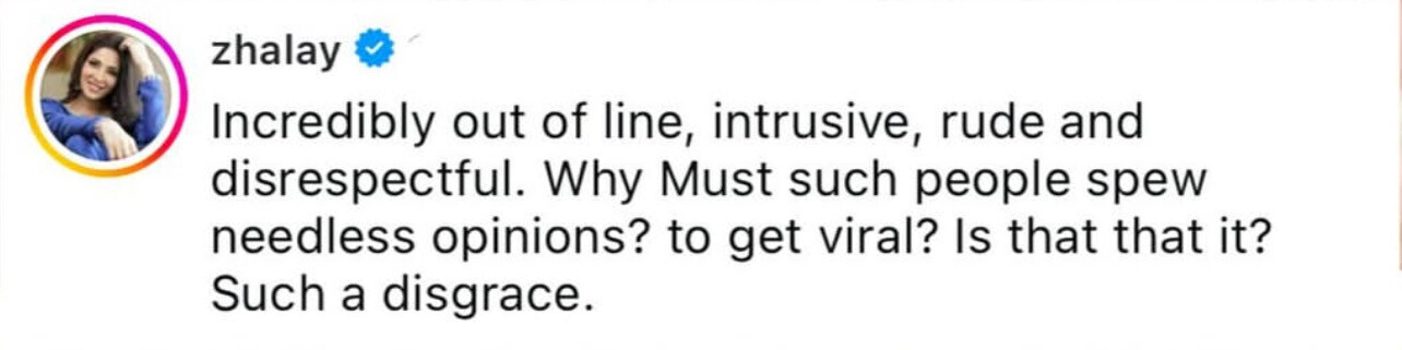 اداکارہ ژالے سرحدی نے انہیں تنقید کا نشانہ بناتے ہوئے لکھا کہ روبی انعم کا رویہ انتہائی نامناسب، دخل اندازی، بدتمیزی اور توہین آمیز ہے، ایسی شخصیات غیر ضروری رائے کیوں دیتی ہیں؟ وائرل ہونے کے لیے؟ یہ شرمناک ہے۔