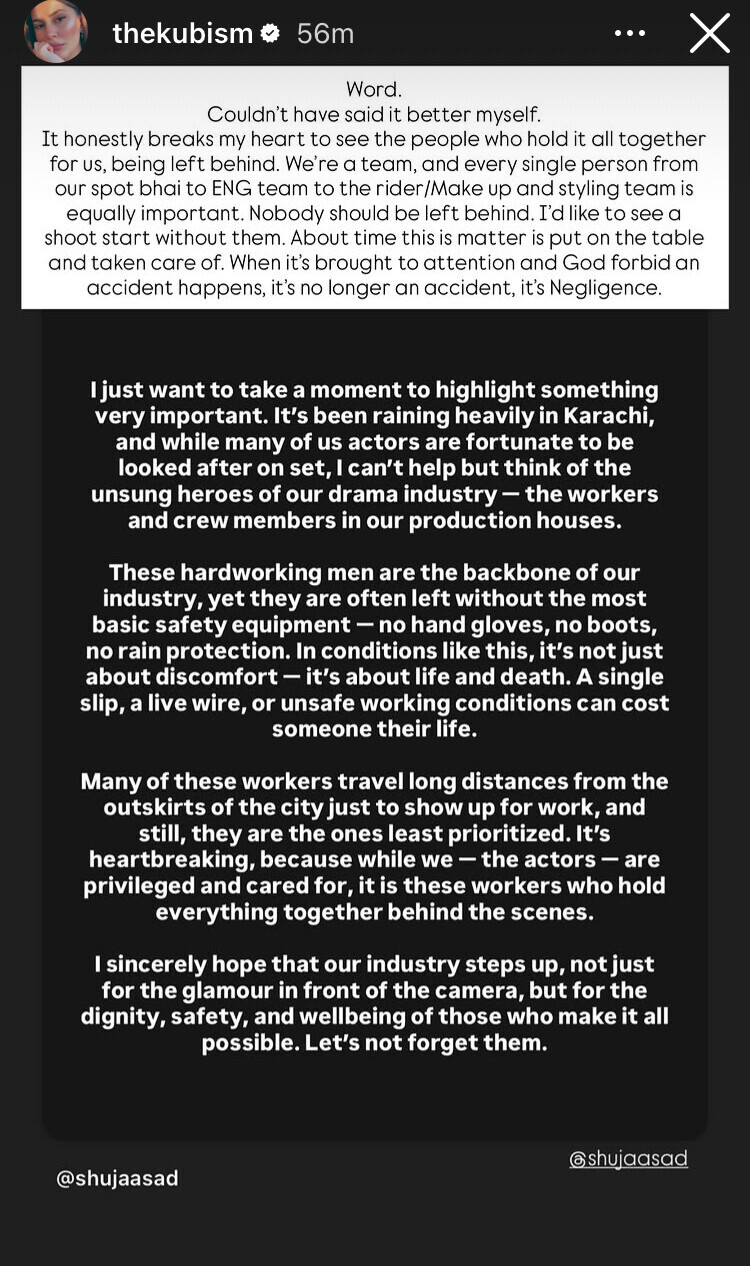 اداکار نے انسٹاگرام پر شیئر کی گئی ایک پوسٹ میں ڈراما انڈسٹری کے گمنام ہیروز کے بارے میں بات کرتے ہوئے کہا کہ کراچی میں مسلسل بارش کے دوران وہ پروڈکشن ہاؤسز کے ملازمین اور کریو ممبرز کے بارے میں سوچے بغیر نہیں رہ سکے۔