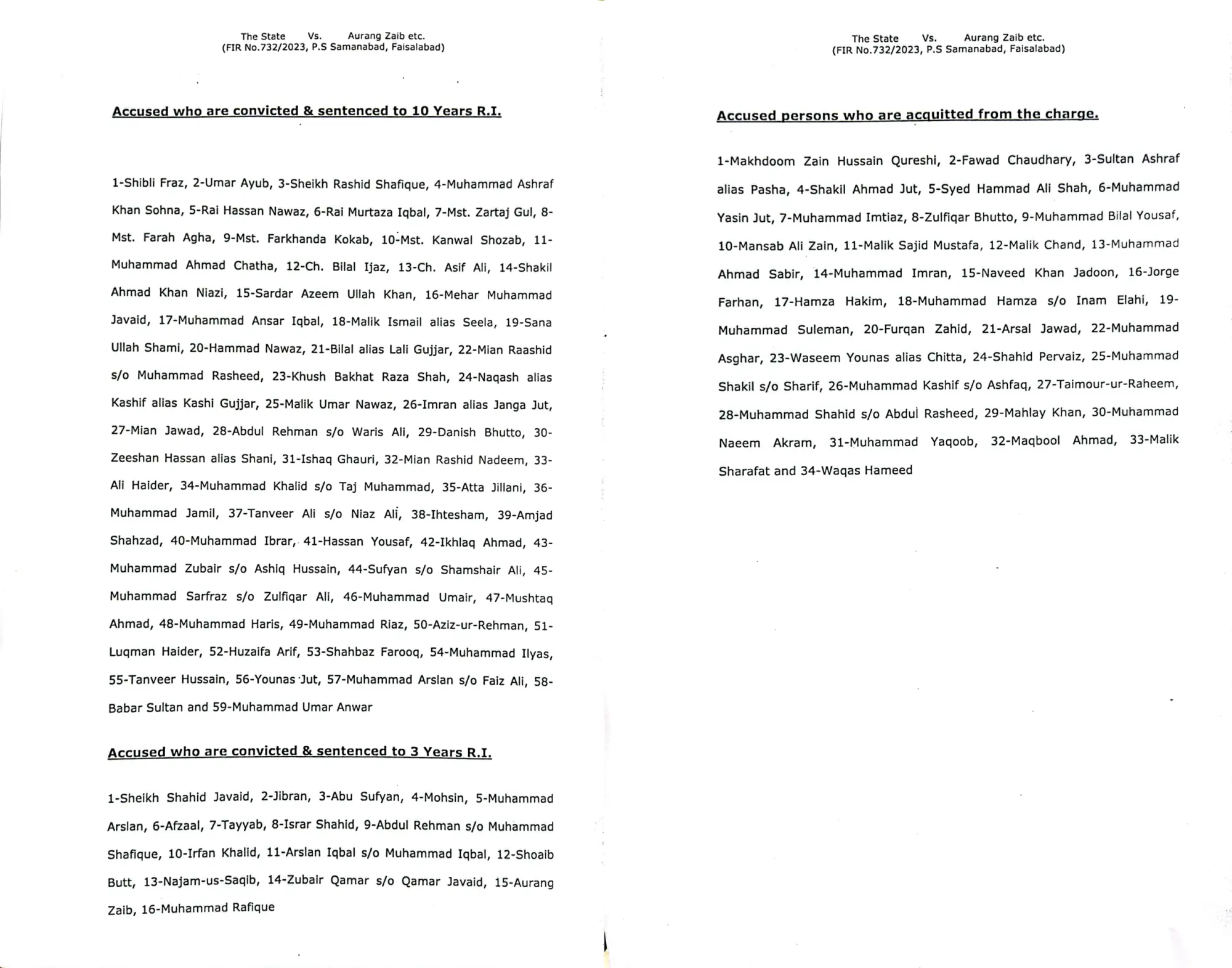 عدالت نے فیصل آباد سے پی ٹی آئی کے رکن صوبائی اسمبلی اسمٰعیل سیلا، شیخ شاہد جاوید، فرح آغا، کنول شوزب، شیخ راشد شفیق، رائے مرتضیٰ، عنصر اقبال، بلال اعجاز، اشرف سوہنا، مہر جاوید اور شکیل نیازی کو بھی 10،10 سال قید کی سزا سنائی۔
