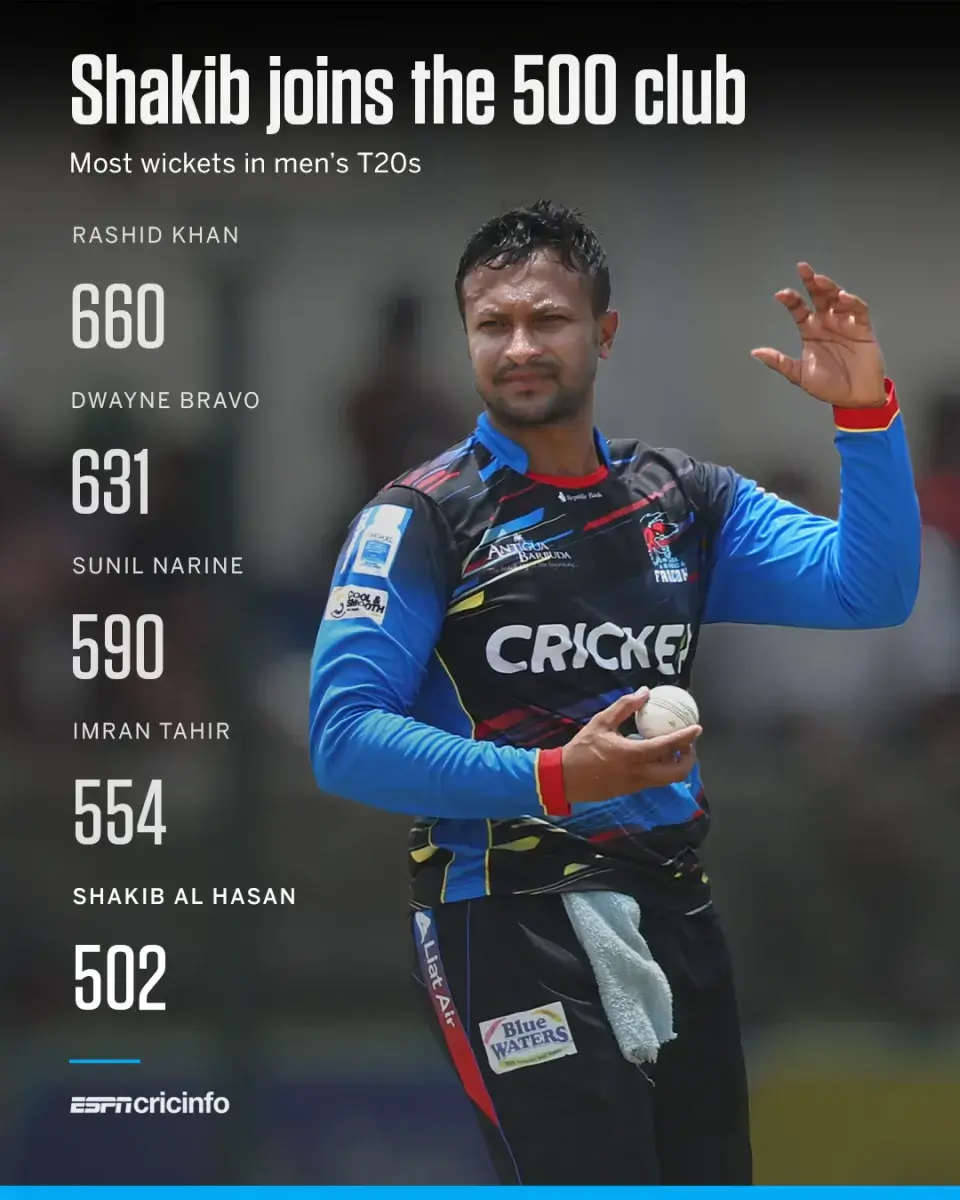 بنگلہ دیش کے سابق کپتان اور مایہ ناز آل راؤنڈر شکیب الحسن نے اپنے شاندار ٹی20 کریئر میں ایک اور کارنامہ انجام دے دیا، وہ 500 وکٹیں مکمل کرنے والے دنیا کے پانچویں باؤلر بن گئے ہیں۔