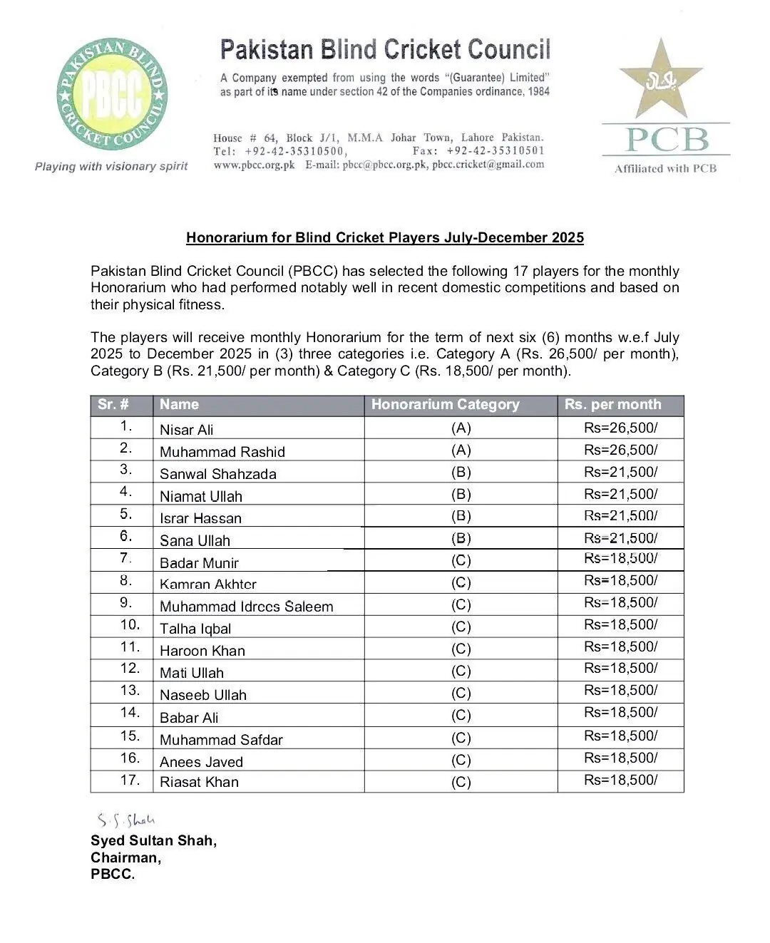پاکستان بلائنڈ کرکٹ کونسل اے کیٹگری کو ماہانہ 26 ہزار 500 روپے ادا کرے گا، بی کیٹگری کو 21 ہزار 500 جب کہ سی کیٹگری کے کھلاڑیوں کو 18 ہزار 500 روپے اعزازیہ دے گی۔