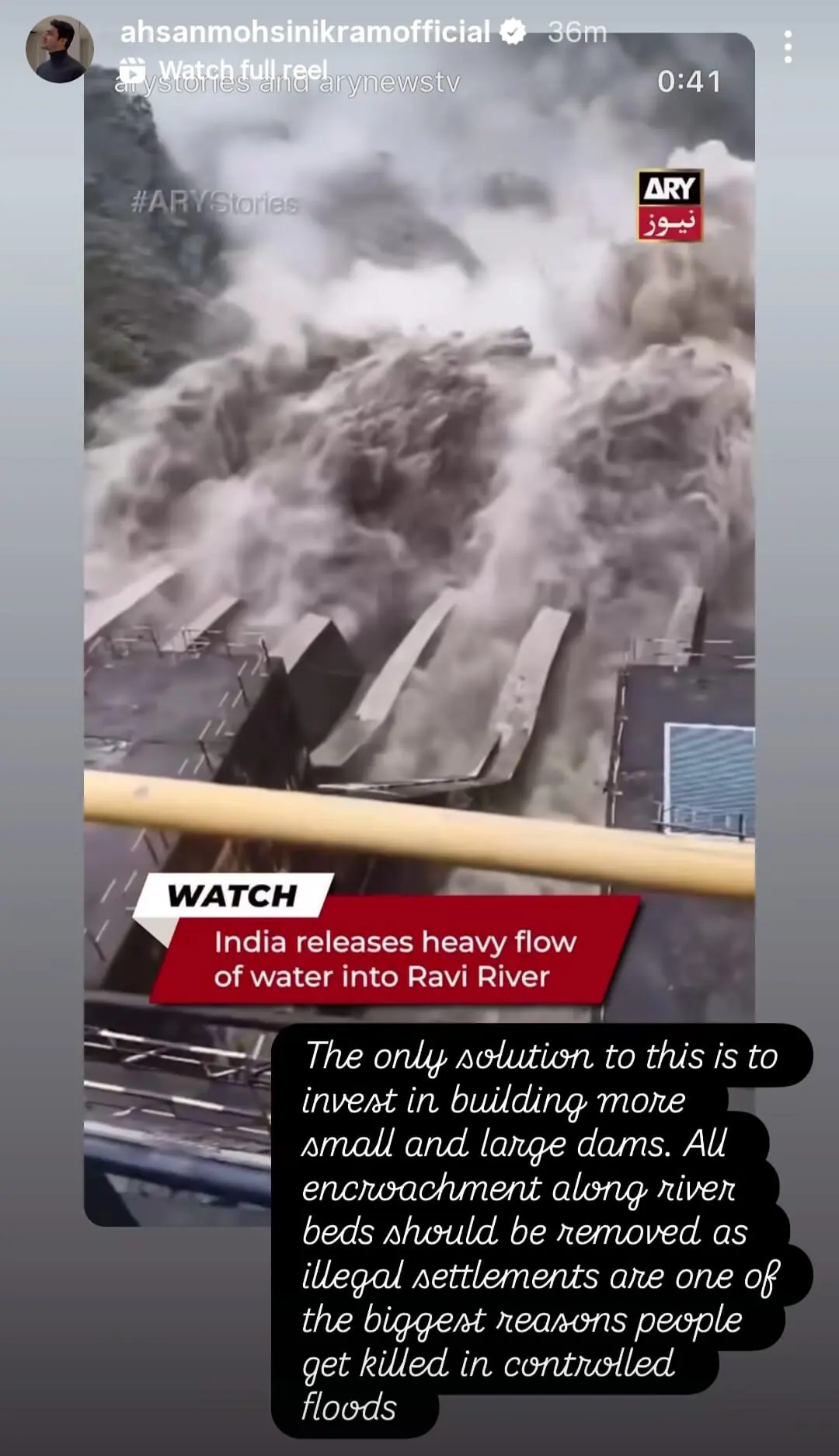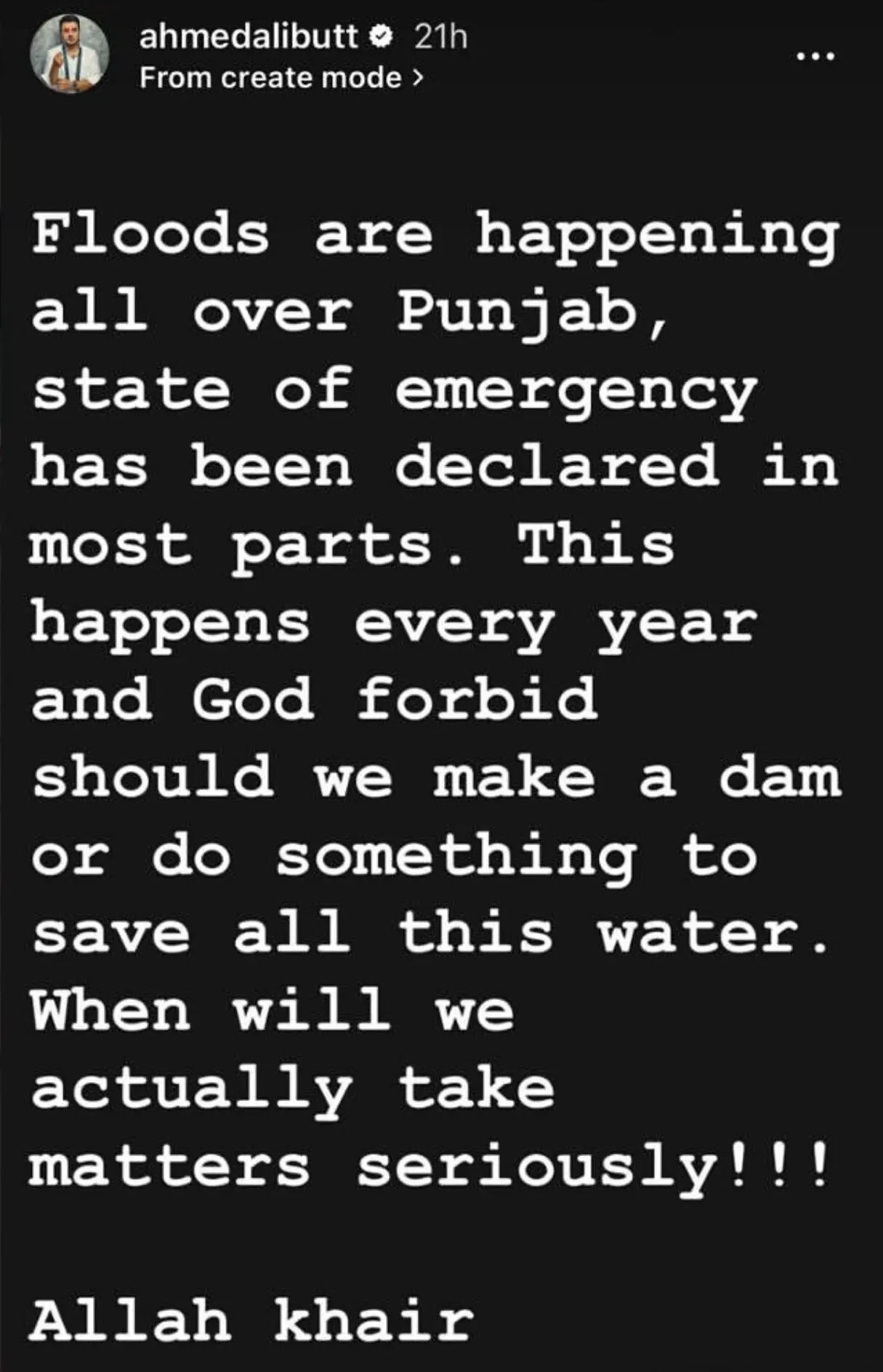 اداکار احمد علی بٹ نے مایوسی کا اظہار کرتے ہوئے لکھا کہ پنجاب میں ہر جگہ سیلاب آ رہے ہیں، بیشتر حصوں میں ہنگامی حالت نافذ کر دی گئی ہے، یہ ہر سال ہوتا ہے، آخر کب ہم واقعی معاملات کو سنجیدگی سے لیں گے؟