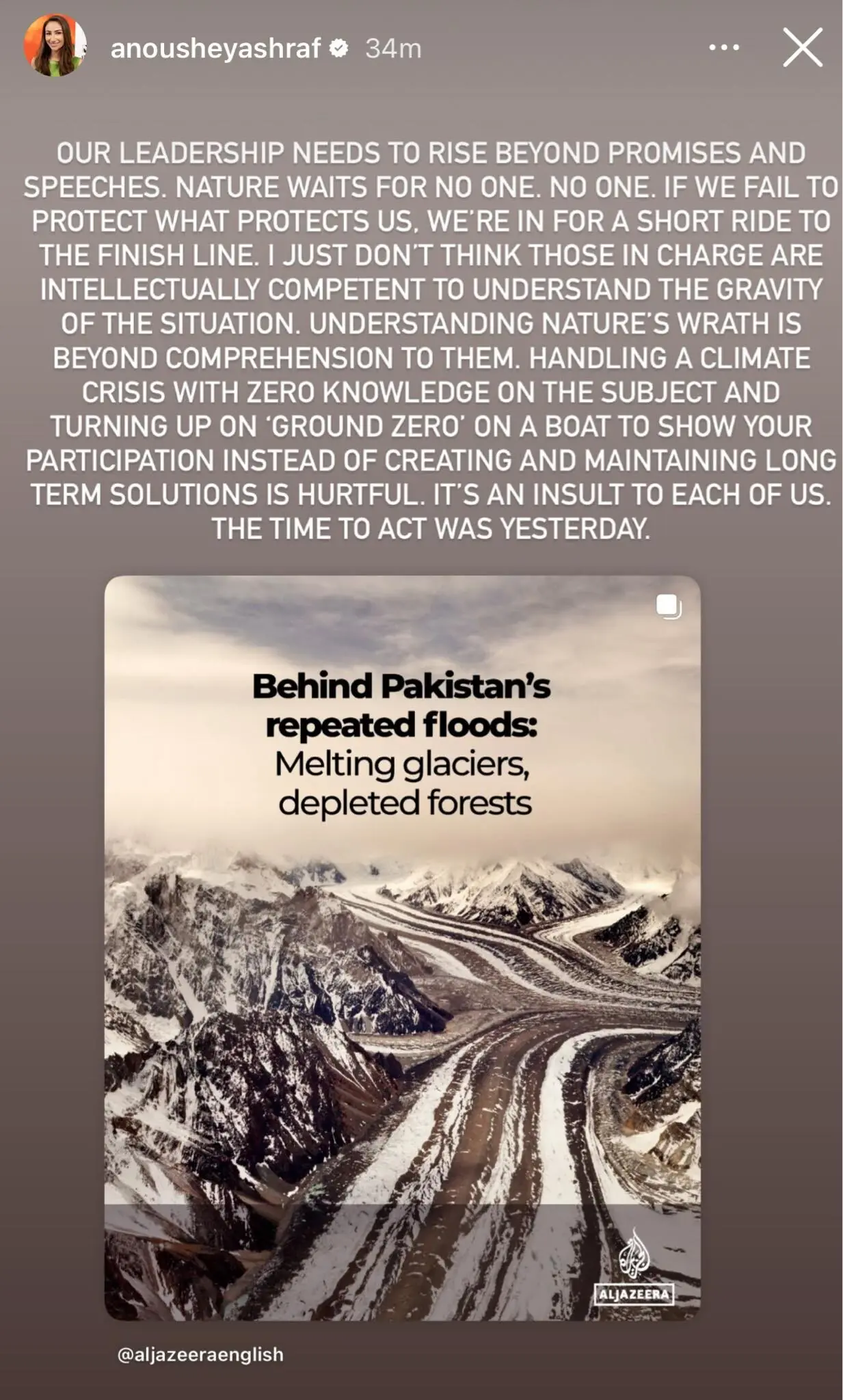 انوشے اشرف نے حکومت کو تنقید کا نشانہ بناتے ہوئے لکھا کہ ہماری قیادت کو وعدوں اور تقاریر سے آگے بڑھ کر اقدام کرنا ہوگا، قدرت کسی کا انتظار نہیں کرتی۔