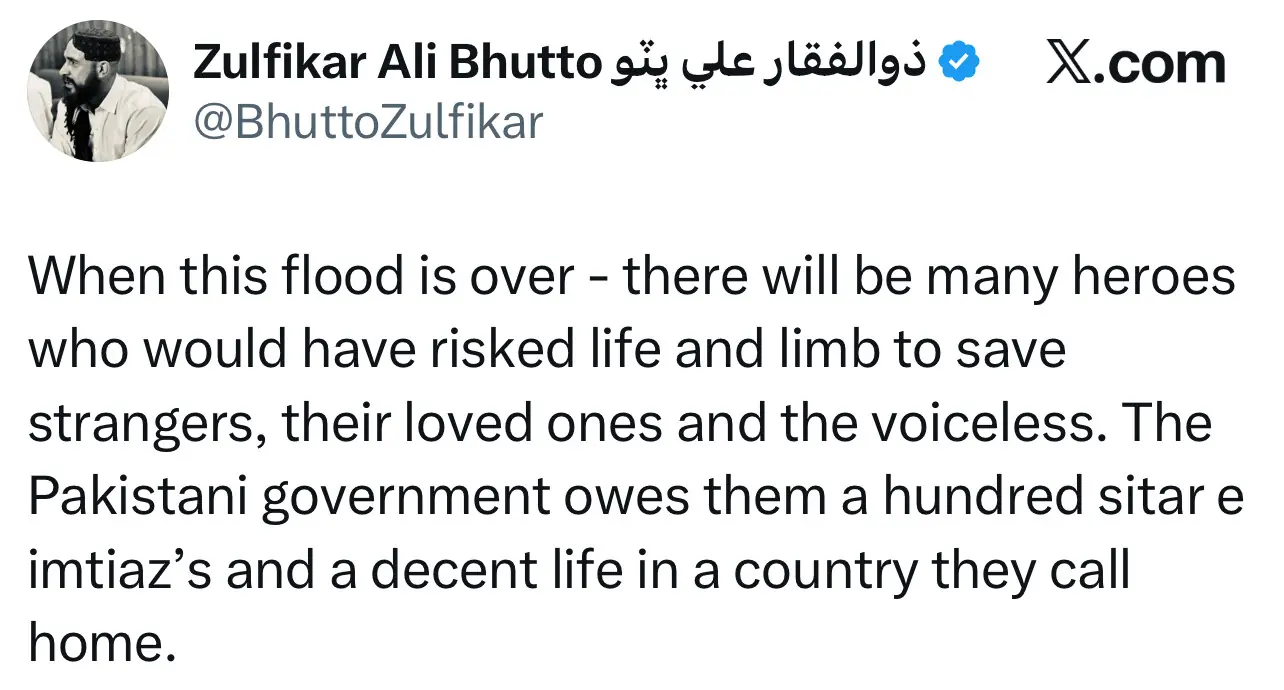 ایکس (سابقہ ٹوئٹر) پر آرٹسٹ اور سرگرم کارکن ذوالفقار علی بھٹو جونیئر نے عام لوگوں کی بہادری کو اجاگر کرتے ہوئے لکھا کہ جب یہ سیلاب ختم ہوگا، تو بہت سے ایسے ہیرو ہوں گے جنہوں نے اجنبیوں، اپنے پیاروں اور بے آواز لوگوں کی جانیں بچانے کے لیے اپنی جان خطرے میں ڈالی ہوگی ان کے نام سامنے آئیں گے، حکومت ان تمام لوگوں کی مقروض ہے۔