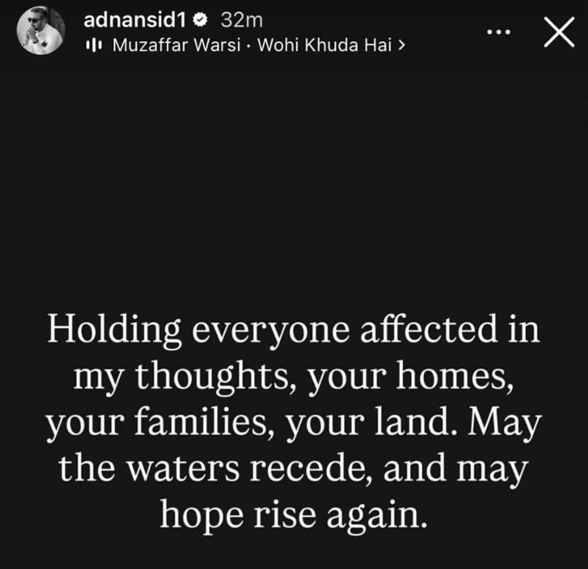 اداکار عدنان صدیقی نے متاثرہ لوگوں کے لیے دعا کرتے ہوئے لکھا کہ اللہ کرے پانی پیچھے ہٹے اور امید دوبارہ اُبھرے۔