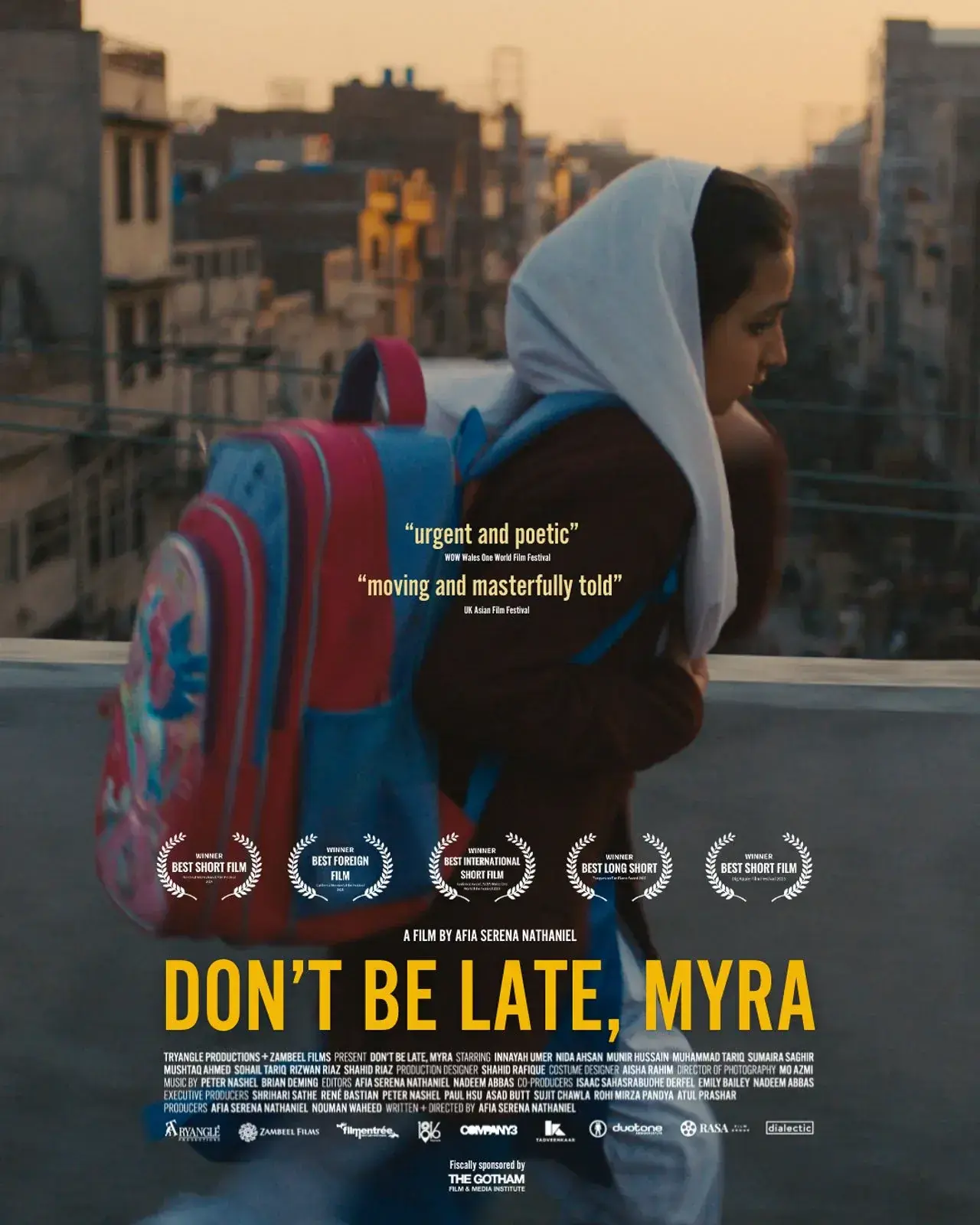 فلم ’ڈونٹ بی لیٹ، مائرہ‘ ایک نوجوان لڑکی کی کہانی ہے جو اسکول سے گھر جانے والی وین چھوٹ جانے کے بعد لاہور اور زندگی کی جھلک پیش کرتی ہے، یہ 15 منٹ کی تھرلر فلم ایک حقیقی کہانی پر مبنی ہے اور دنیا بھر کے فلم فیسٹیولز میں کافی کامیاب رہی ہے، جن میں نیو جرسی کے برگن انٹرنیشنل فلم فیسٹیول، مونٹریال انٹرنیشنل فلم فیسٹیول، نیو یارک کے بگ ایپل فلم فیسٹیول، یو کے ایشین فلم فیسٹیول، ووڈ اسٹاک فلم فیسٹیول اور دیگر شامل ہیں، جہاں اس نے متعدد انعامات جیتے ہیں۔