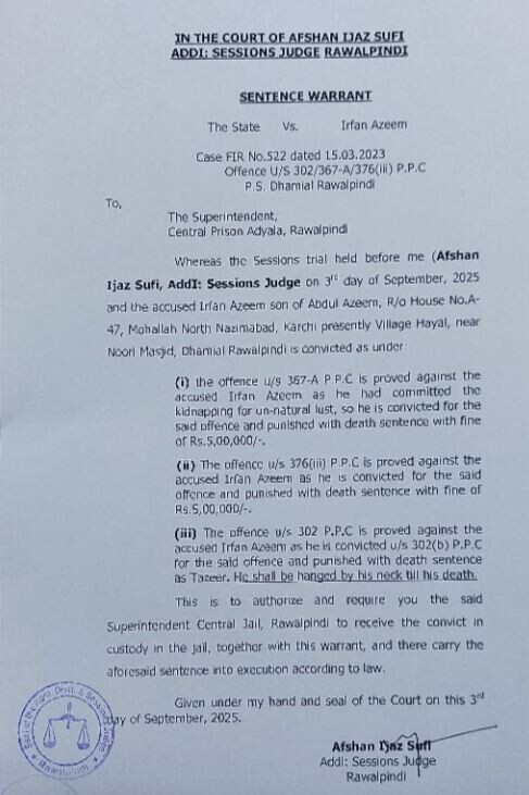 ڈان نیوز کے مطابق راولپنڈی کے ایڈیشنل سیشن جج افشان اعجاز صوفی نے کمسن بچے کو اغوا کرنے کے بعد زیادتی کرکے قتل کرنے والے مجرم کے خلاف فیصلہ سنایا۔