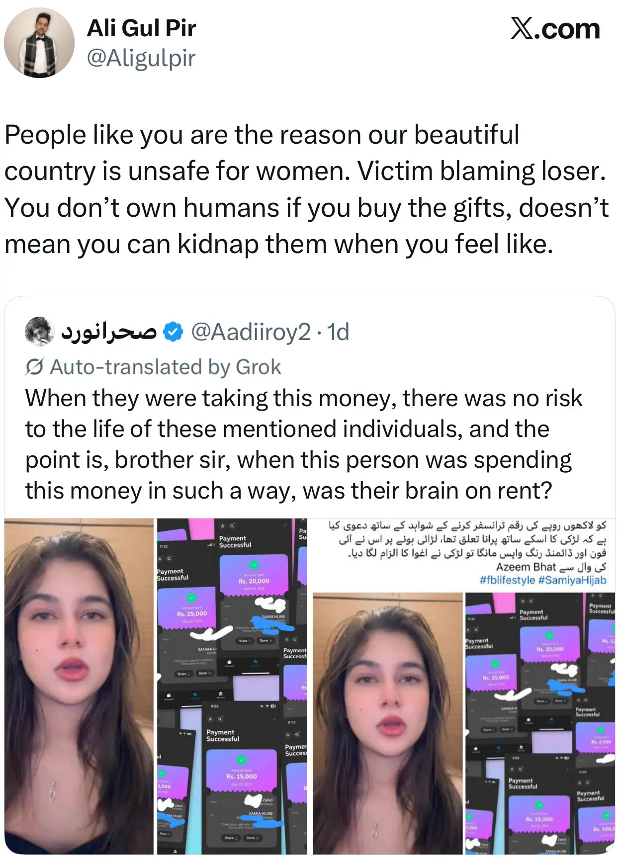 علی گل پیر نے ایکس صارف کی نشاندہی کی، جس نے مبینہ اغوا کی کوشش کو یہ کہتے ہوئے جائز ٹھہرانے کی کوشش کی کہ سامعہ نے لڑکے سے پیسے لیے تھے۔