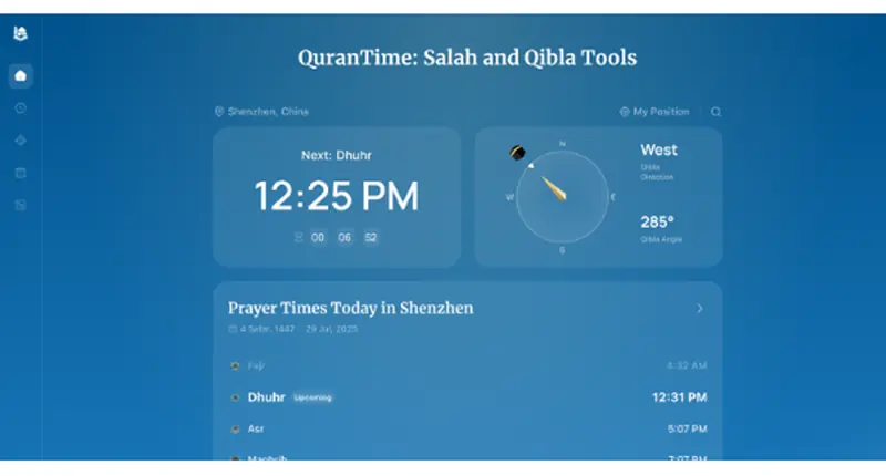 QuranTime کا استعمال بہت آسان ہے۔ ویب سائٹ کھولیں، اور پلیٹ فارم خود بخود آپ کے مقام کا پتہ لگا کر دن کے درست نماز کے اوقات دکھاتا ہے۔ کسی رجسٹریشن یا ترتیب کی ضرورت نہیں ہے۔ انٹرفیس پانچوں روزانہ نمازوں کی فہرست ٹائمر کے ساتھ دکھاتا ہے جو اگلی نماز میں باقی وقت ظاہر کرتا ہے۔ یہ خصوصیت مصروف شیڈول والے لوگوں کے لیے خاص طور پر مفید ہے، کیونکہ یہ خاموشی سے تیاری کی یاد دہانی کراتا ہے۔