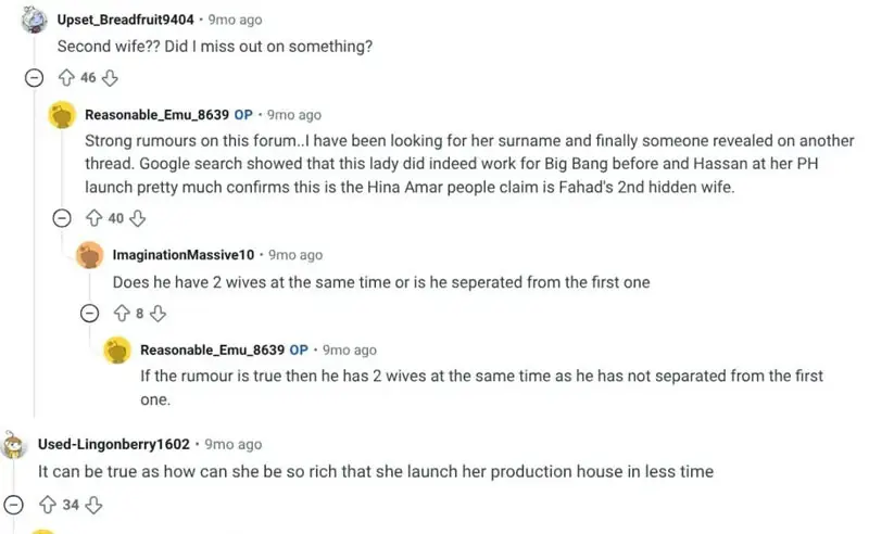 ریڈٹ کی پوسٹ پر صارفین نے سوالیہ انداز میں تبصرے کیے کہ خاتون مبینہ طور پر فہد مصطفیٰ کی دوسری اہلیہ ہیں۔