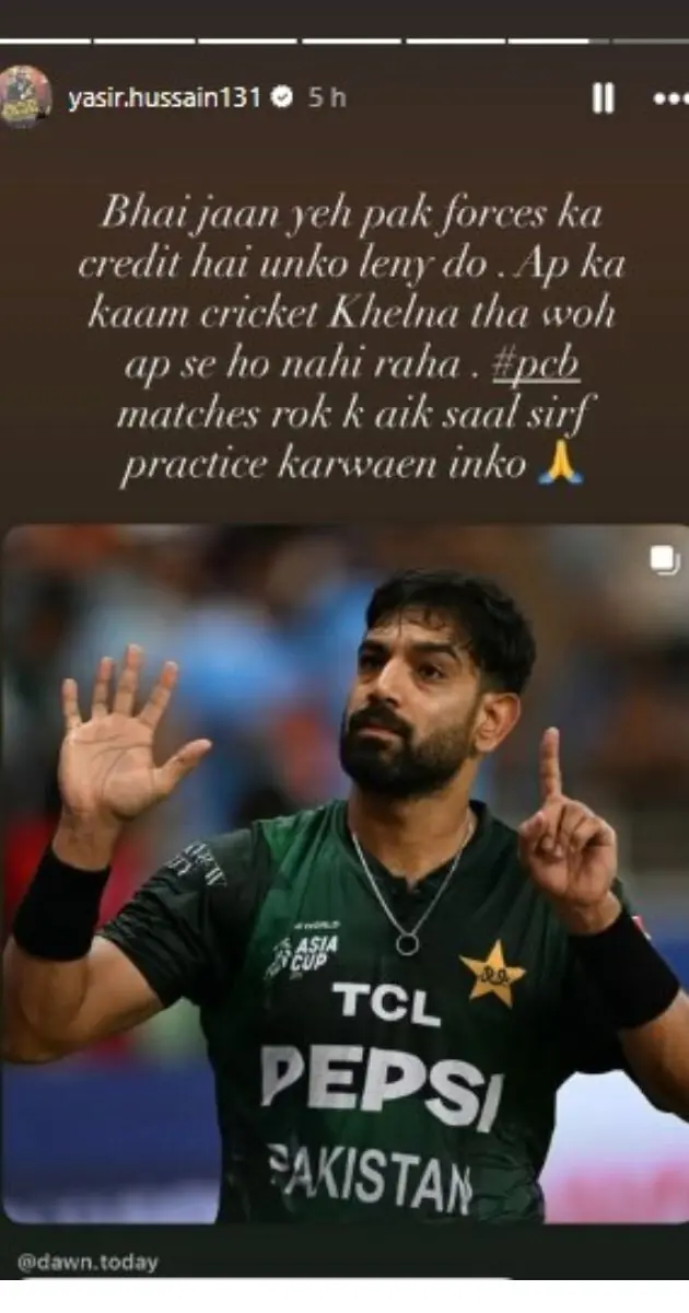تاہم، یاسر حسین نے حارث رؤف کے عمل پر تنقید کرتے ہوئے انسٹاگرام اسٹوری میں لکھا کہ ’بھائی جان، یہ پاکستان ایئر فورس کا کریڈٹ ہے، انہیں دے دو، آپ کا کام کرکٹ کھیلنا تھا، جو آپ سے ہو نہیں رہا‘۔