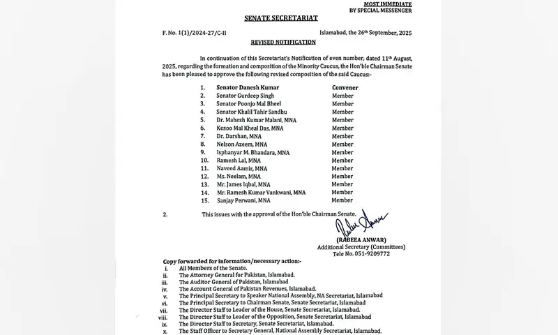چیئرمین سینیٹ نے اقلیتی کاکس کی نئی تشکیل کی منظوری دیتے ہوئے سینیٹر دنیش کمار کو کاکس کا کنوینر مقرر کر دیا، کاکس کے ممبران کی کُل تعداد 15 ہے۔