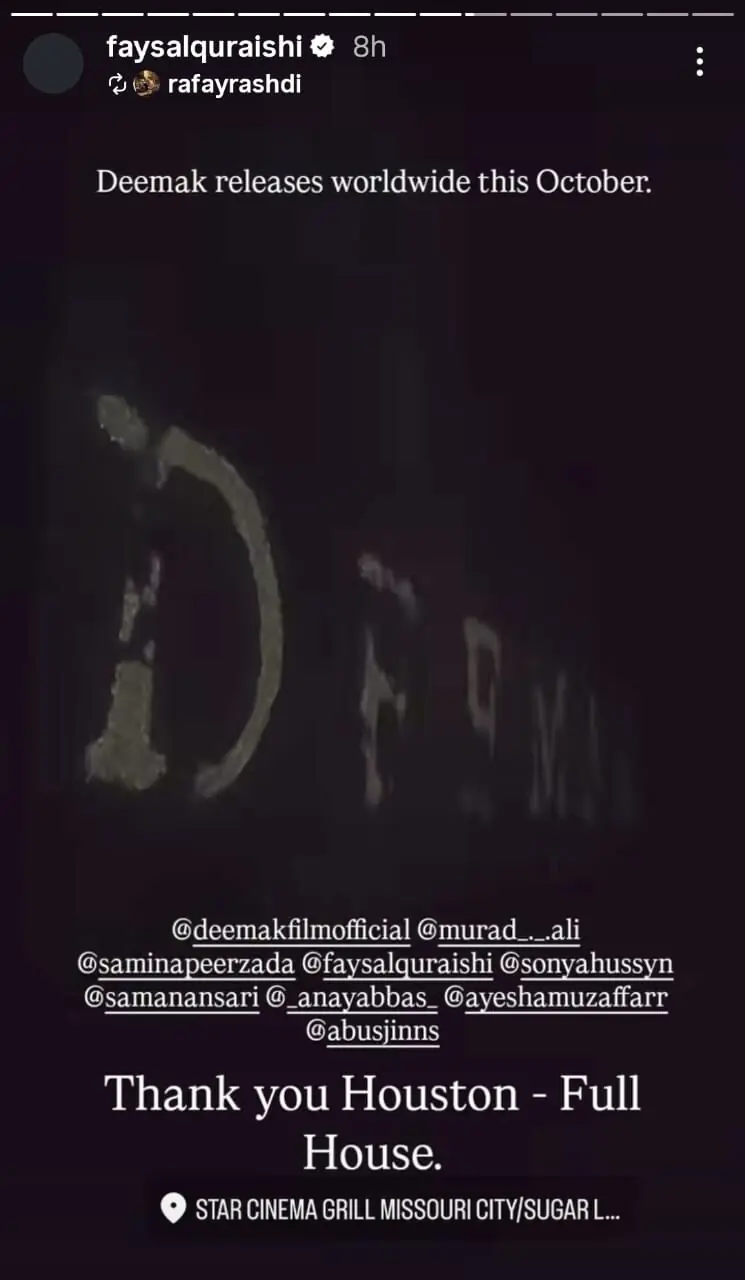 اس موقع پر میڈیا سے گفتگو کرتے ہوئے فیصل قریشی نے کہا کہ امید ہے کہ ’دیمک‘ کو امریکا میں بھی وہی محبت ملے گی جو پاکستان میں ملی، یہ فلم پاکستانی سنیما کی نئی پہچان بنا رہی ہے۔