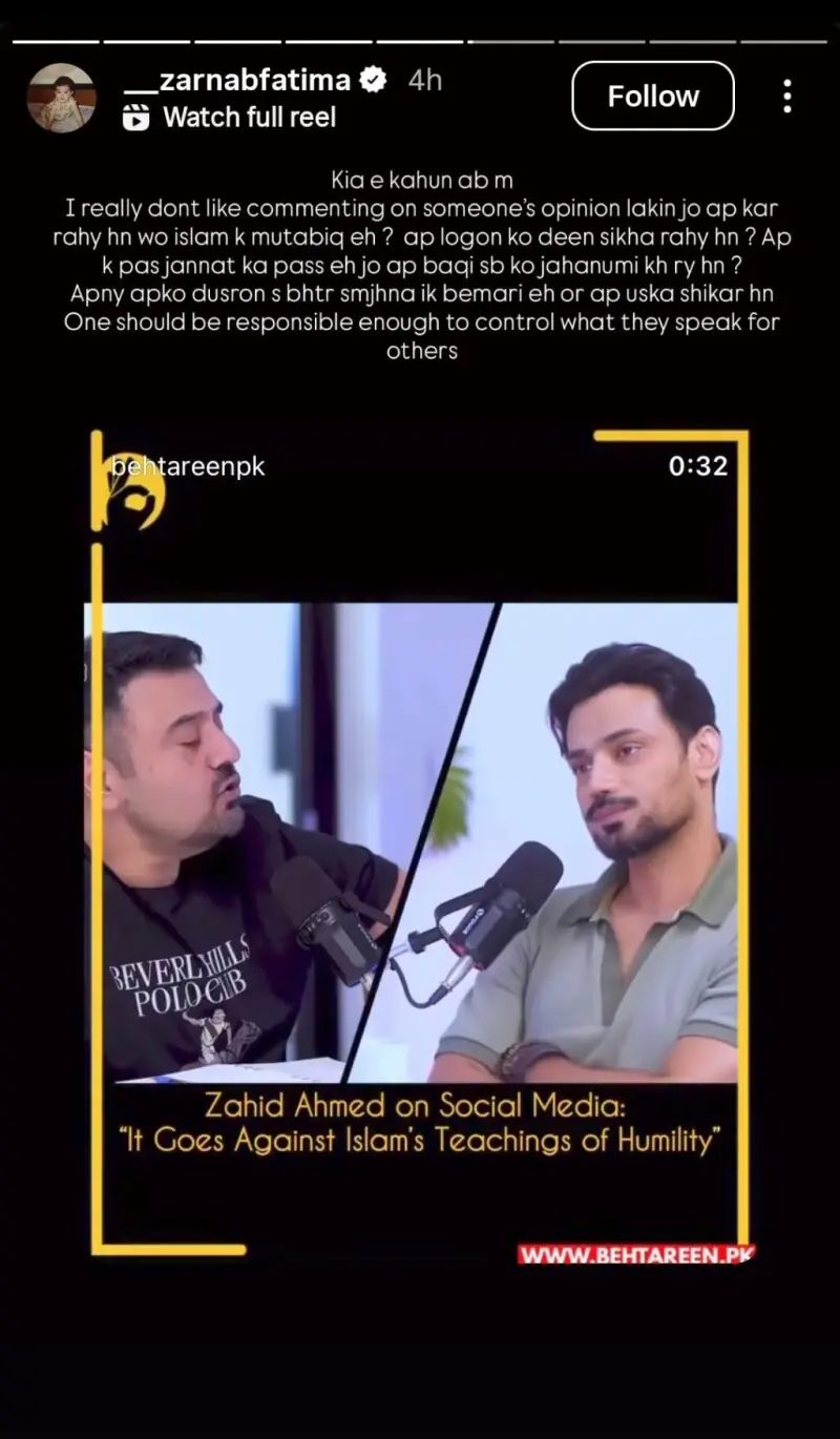 کاننٹینٹ کریئیٹر زرناب فاطمہ نے بھی اس بیان پر انسٹاگرام اسٹوری میں لکھا کہ وہ عام طور پر کسی کی ذاتی رائے پر بات کرنے کے حق میں نہیں لیکن سوال یہ ہے کہ جو کچھ اداکار کر رہے ہیں کیا وہ اسلام کے مطابق ہے؟ کیا وہ لوگوں کو دین کی صحیح تعلیم دے رہے ہیں؟