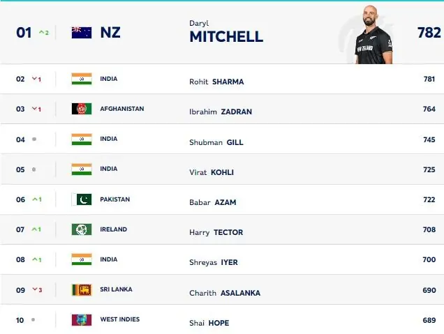 آئی سی سی کی تازہ ترین ون ڈے رینکنگ جاری کر دی گئی، جس میں نیوزی لینڈ کے ڈیرل مچل نے سابق بھارتی کپتان روہت شرما سے پہلی پوزیشن چھین لی۔