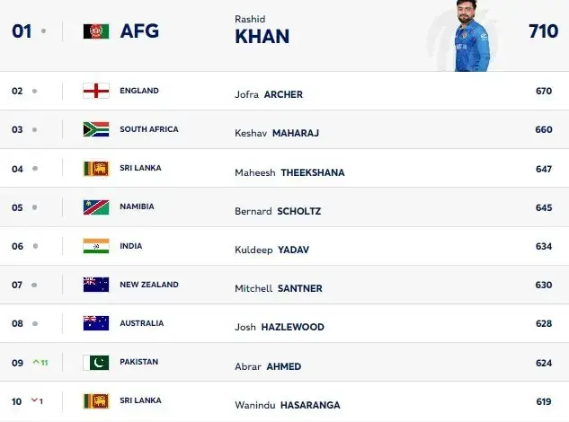 دوسری جانب، پاکستان کے مسٹری اسپنر ابرار احمد نے جنوبی افریقہ، سری لنکا کے خلاف شاندار کارکردگی کا مظاہرہ کرتے ہوئے پہلی بار ٹاپ ٹین میں جگہ بنالی، وہ باؤلنگ رینکنگ میں نویں نمبر پر آگئے۔