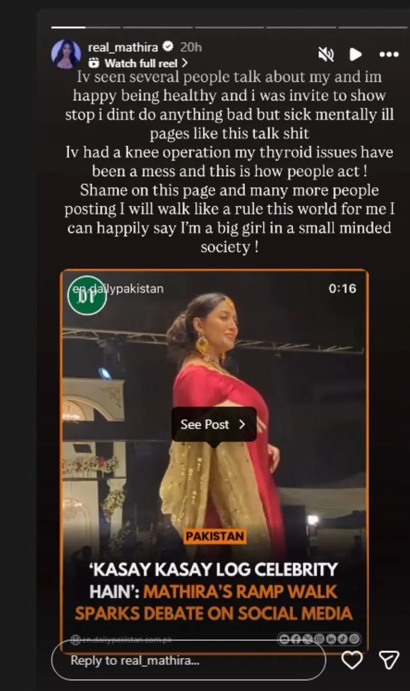 متھیرا نے انسٹاگرام اسٹوری میں اپنے ریمپ واک کی ویڈیو کلپ شیئر کرتے ہوئے تنقید کرنے والوں کو کرارا جواب دیا۔