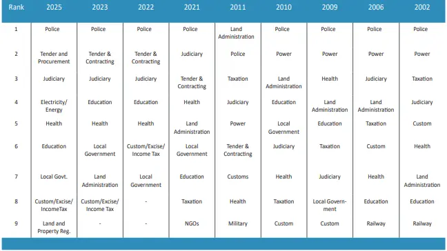 یہ شعبہ پچھلے سرویز میں بھی مسلسل سب سے زیادہ بدعنوان قرار دیا گیا ہے۔