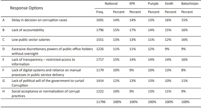 نتائج سے پتہ چلا کہ احتساب، شفافیت کی کمی، معلومات تک محدود رسائی اور بدعنوانی کے کیسز کی کارروائی میں تاخیر ملک میں بدعنوانی کے ’اہم اسباب‘ ہیں۔