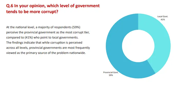 مزید برآں، 59 فیصد نے یہ تسلیم کہ صوبائی حکومتیں مقامی حکومتوں کے مقابلے میں زیادہ بدعنوان ہیں۔