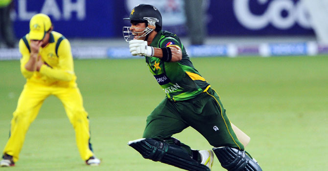 جیت کے بعد عمر اکمل خوشی کا اظہار کررہے ہیں۔ پس منظر میں ایک آسٹریلوی کھلاڑی مایوس نظر آرہا ہے۔ اے ایف پی فوٹو