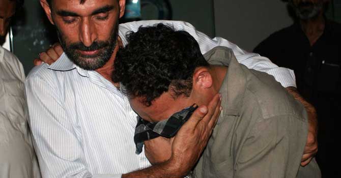 سولہ اگست کو مانسہرہ بس حملے میں ہلاک ہونے والے ایک شیعہ کے عزیز کو دوسرا شخص تسلی دے رہا ہے۔ اے ایف پی تصویر