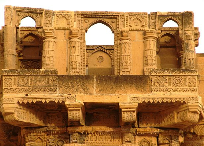 خطِ نسخ میں خطاطی اور محراب اسلامی فنِ تعمیرات کی عکاس ہیں تو گجراتی محّلات کے طرز پر جھروکے بھی ہیں۔ جن پر جَین اور ہندو مت کے قدیم اَدوار کے مندروں جیسے سنگی نمونوں کا حسین امتزاج بھی نمایاں ہے۔