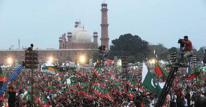 تحریک انصاف کے لاہور کے مینار پاکستان پر منعقدہ جلسے کے موقع پر عمران خان کے حامی جلسہ گاہ میں جمع ہیں۔ فوٹو اے ایف پی